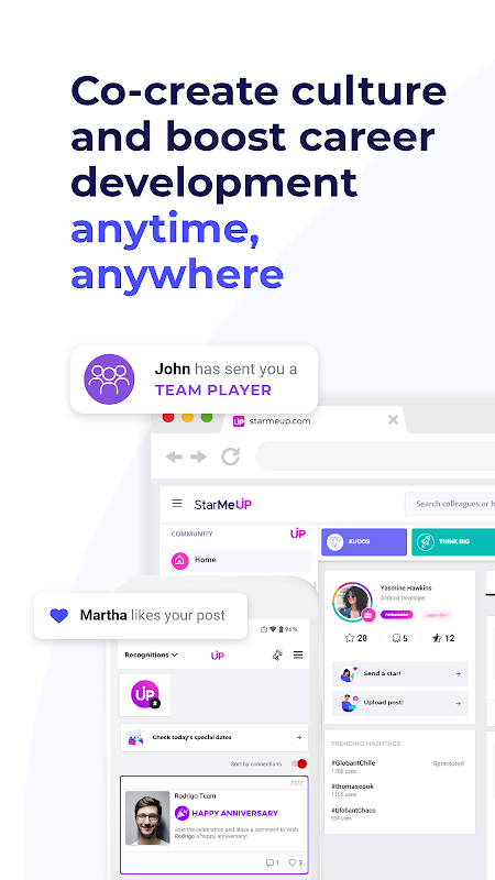 StarMeUp est la première plateforme basée sur la science comportementale et améliorée par l'IA qui aide les entreprises à optimiser leur propre culture. Sans manipulations ni récompenses. Nous cultivons chaque jour une vraie culture avec des expériences authentiques.
