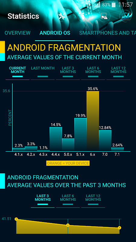 Statistiques et statistiques Pro fournissent des données statistiques globales et la mise à jour des 12 derniers mois pour les smartphones et tablettes Android, toujours par rapport à votre appareil.