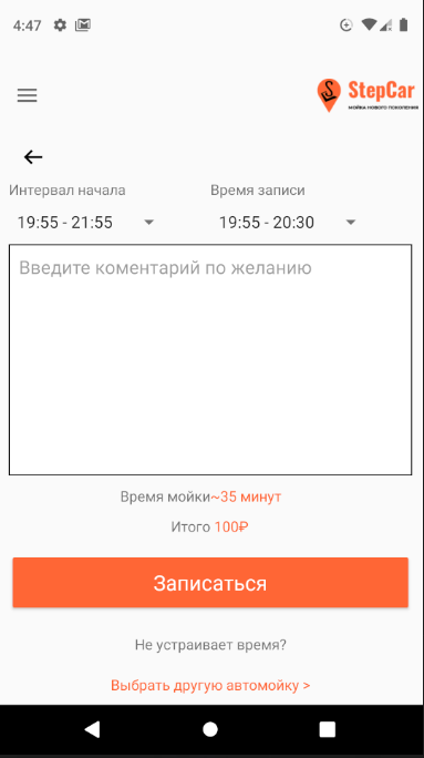 Скачивайте приложение и мойте машину в выбранное Вами время. StepCar подскажет когда начнут и когда закончат.