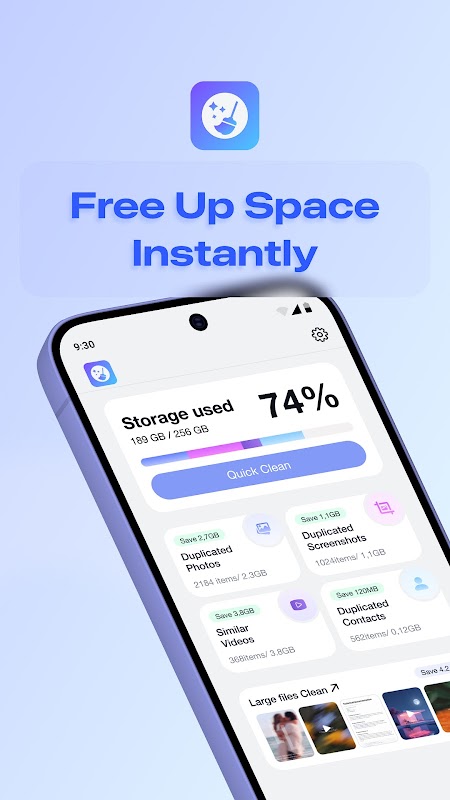 Storage Cleaner vous aide à consulter, gérer et organiser les fichiers stockés sur votre appareil. L'application fournit des outils pour identifier les photos, vidéos, captures d'écran, contacts et fichiers volumineux en double, afin que vous puissiez facilement décider ce que vous souhaitez conserver ou supprimer.