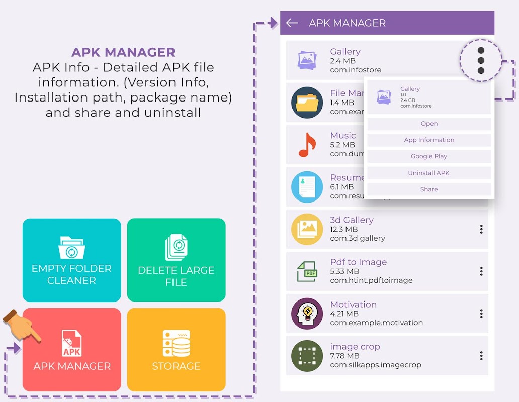 - APK Info - Detailed APK file information. (Version Info, Installation path, package name), APK Share - Share APK Files to anyone, and any of their devices easily. You can easily uninstall app.