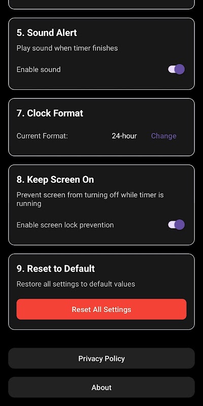 Interface utilisateur au thème sombre avec de grandes polices numériques pour une concentration et une visibilité optimales.