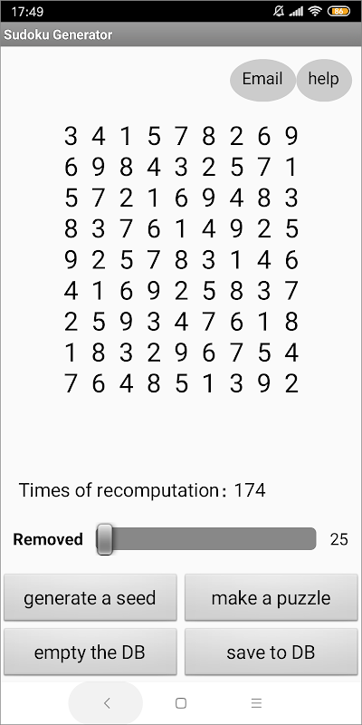 2. Faites des puzzles à partir de graines de sudoku en réglant des difficultés différentes. La difficulté est décidée en fonction du nombre de numéros supprimés, de 25 à 55.