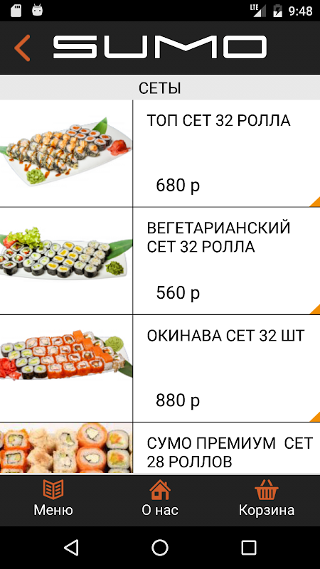 В меню ресторана "SUMO" представлены, суши, разнообразные роллы, горячие блюда, овощи и морепродукты, великолепные сеты, а также Узбекская, Европейская кухня что делает наш ассортимент большим и доступным для всех.