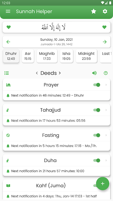 "Sunnah Helper" est un outil pour définir des notifications pour les prières, le jeûne, les prières nocturnes, les prières duha et d'autres actes de sunnah.