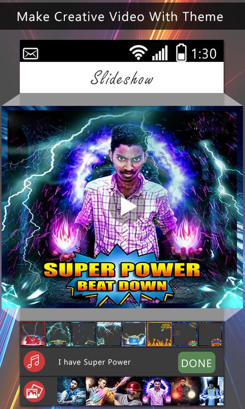Super Power Video Maker With Music app helps you to create Image Slide-show from your mobile in seconds, along with slide time, frames and filter effects. Create beautiful Super Power Movie Slideshow With Song and share with friends and family for best occasions in life.
