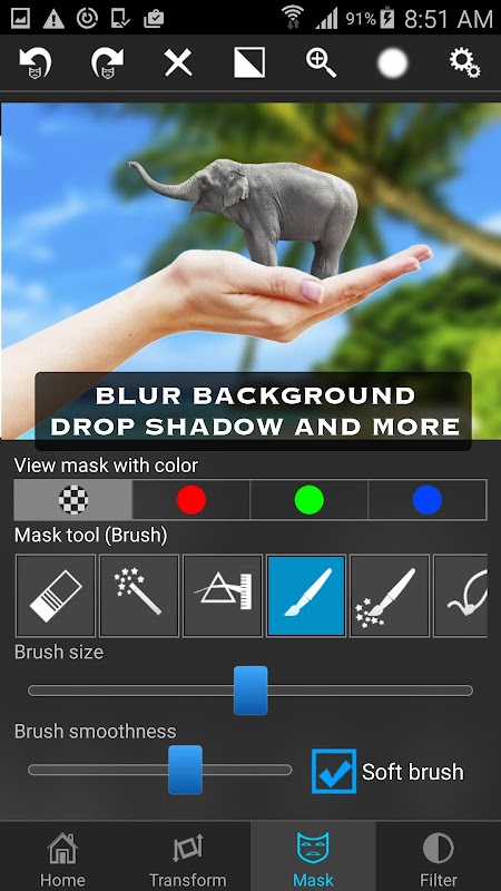 Masking dans l'application est le plus puissant disponible sur l'App Store, juste taper sur une zone de la photo, et l'application va masquer toutes les zones connectées avec des couleurs similaires. Ou vous pouvez utiliser une brosse, Lasso, similitude de couleur globale, rectangle, ellipse, linéaire, bi-linéaire ou radial des outils gradient de masquage. Masque une partie avec cet outil et la partie de l'image de premier plan deviendra transparent et de révéler l'arrière-plan.