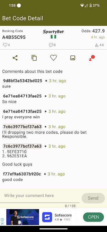 Sure Bet Codes est un marché en ligne gratuit où vous pouvez obtenir des conseils de pronostiqueurs professionnels et également copier leurs codes de pari ou les bulletins qu'ils partagent sur l'application. Obtenez un accès gratuit à Correct Scores tous les jours. L'application dispose d'une interface utilisateur élégante et intuitive qui vous apporte toutes les informations sur vos sports préférés à tout moment, n'importe où.