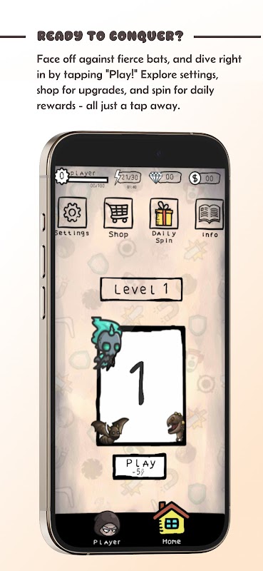 Contrôlez facilement votre personnage à l'aide de commandes intuitives à une main, où le héros attaque automatiquement, permettant aux joueurs de se concentrer sur l'esquive et le positionnement. À chaque batte vaincue, les joueurs gagnent des points d'expérience et montent de niveau, accédant à des améliorations et à de nouvelles capacités, telles que des armes plus puissantes, des boucliers, un aimant ou des compétences uniques comme le boomerang, le carreau et le rasoir.