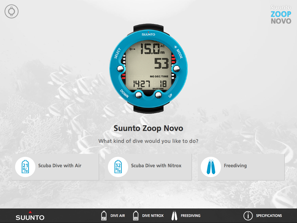 This tool shows you how to perform a variety of tasks, from setting up air and nitrox diving modes, through to accessing dive logs. In addition, this tool features virtual dives (air, nitrox and freediving), showing you how the computer operates during a dive.