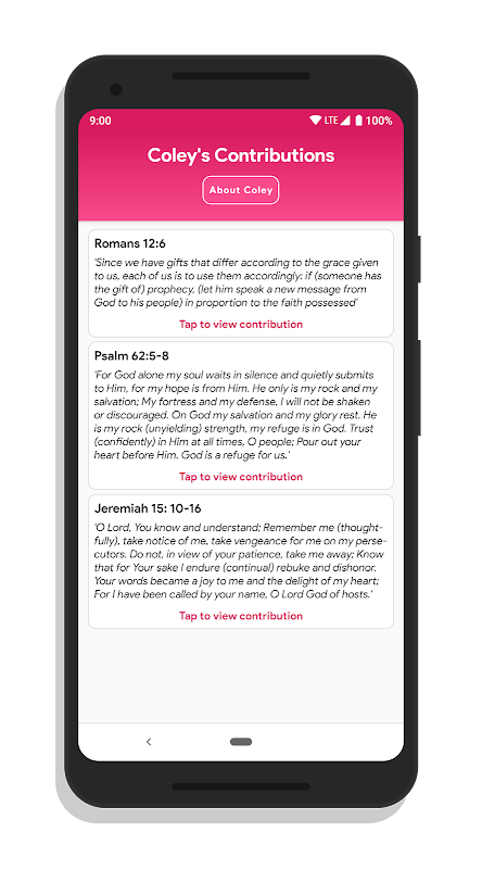 Sword of the Spirit is a Bible companion (not a full Bible app) that encourages taking your reading much further. This app allows you to save your favorite or most meaningful verses and flair them with tags, such as Faith, Forgiveness, Grace, Healing, Hope, Joy, Love, Peace, Strength, and Wisdom. Then, throughout the day, you can read and reflect on the verses that you have saved and continue to fill your heart, mind, and soul with the living Word of God, in ways that are special and personal to YOU! Also, this project was a fantastic way for my girlfriend, "Coley" and I, to bring our relationship closer to God and for His purpose. Therefore, Coley has her own section called Coley's Contributions that offer real, insightful, and applicable discussions, explanations, and advice of her favorite Bible verses as she reads, too! Sword of the Spirit contains many other useful and insightful features, such as: