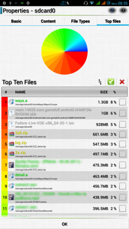 * detailed Storage Analysis - shown details about storage (sdcard, int.storage), largest files + folders, filetypes - user can delete files/folder directly from Storage Analysis! * storage list (system mountpoints)