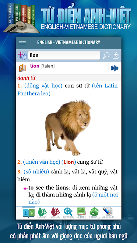 - Dictionnaire anglais-vietnamien avec 300 000 mots avec prononciation complète et près de 5 000 illustrations.