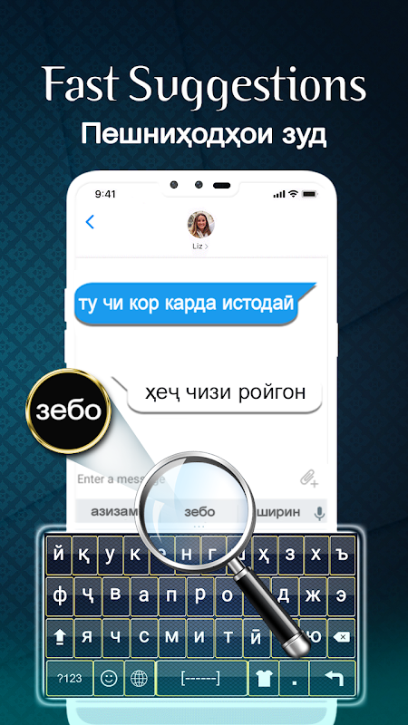 Tadjik et anglais, les deux claviers QWERTY sont très faciles à utiliser pour les utilisateurs de clavier. Clavier tadjik: Le clavier de saisie en langue tadjik est un clavier de saisie rapide et un style unique de clavier de saisie clavier tadjik et anglais pour Android. Clavier tadjik: Le clavier de saisie en langue tadjik est une saisie de frappe rapide et conviviale et un jeu de couleurs attrayant. Profitez de cette application de clavier avec de beaux thèmes avec des boutons élégants. Clavier tadjik: clavier de saisie en langue tadjik ou clavier tadjik pour Android qui apparaîtra après l'avoir sélectionné comme application de clavier par défaut à partir de la méthode de saisie de la langue. Ce clavier apparaîtra à chaque fois lors de la saisie. Écrivez facilement tous les alphabets tadjiks et alphabets anglais.