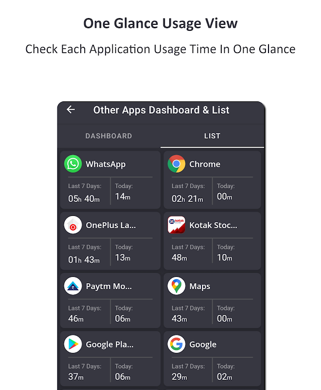 Tableau de bord qui vous montre les données d'utilisation globale de votre téléphone ainsi que la durée d'utilisation des applications. Vous pouvez vérifier le modèle d'utilisation du téléphone en un coup d'œil. Les données d'utilisation quotidienne, hebdomadaire et mensuelle de l'application peuvent être vérifiées.
