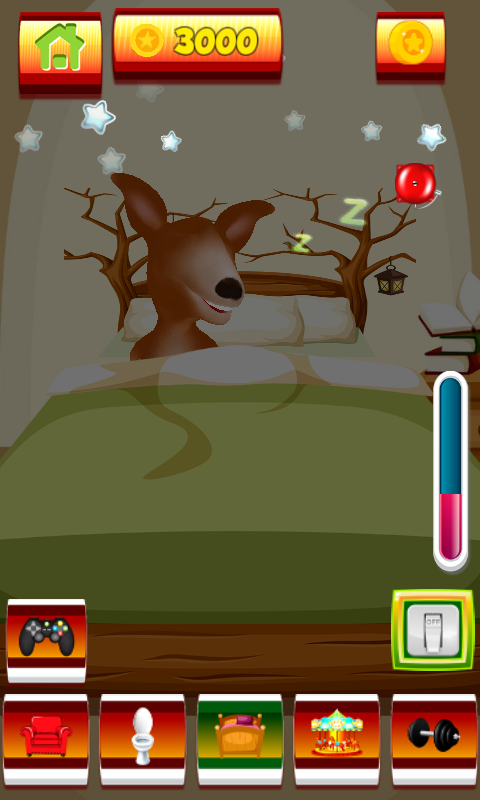 Enjoy the latest kangaroo game free of charge, and be the best guide to your top virtual hero. Come into his beautifully decorated living room, there are many interesting items. Look behind the couch and you will see cute little giraffe. Tap the books to see a smiley face, he turns and jumps around. Check out a window, colorful toucan is here, touch him and he will sing to you. Our pet has musical talents, he knows to play violin and saxophone. You will enjoy in the sounds he performs, listen carefully and you will be amazed. Let’s learn the letters together, just watch the tv screen and repeat. He has a beautiful home gym, because he believes physical exercise matters. He gets his daily workout, because it is very important for kangaroo to stay in shape. He is a proud owner of a treadmill where he can run or walk. Outside there is an awesome playground where this pet loves to spend time. He is very good at sports, and the trampoline is perfect gor his jumping skills, so make sure you make him happy! On the tree you will see a eagle, if you tap him, he will fly away. The popular talking kangaroo is funny, he can dance and he has a beautifully decorated bedroom reserved for his nap time. The red bell is wake him up. His awesome bathroom is reserved for relaxation. That is where this top talking animal can take a bath and brush his teeth. The two of you will play the most amazing mini games and collect coins, in order to unlock the rest of the rooms. Cross all platforms and try to achieve the maximum height. In another mini game do not drop the hammer from your hands and hit this animals as soon as they come out of the pit. Everything is magical in the savanna, and your buddy leads a very impressive life! What do you think? So play the latest kangaroo game application and you will get your daily dose of fun time!