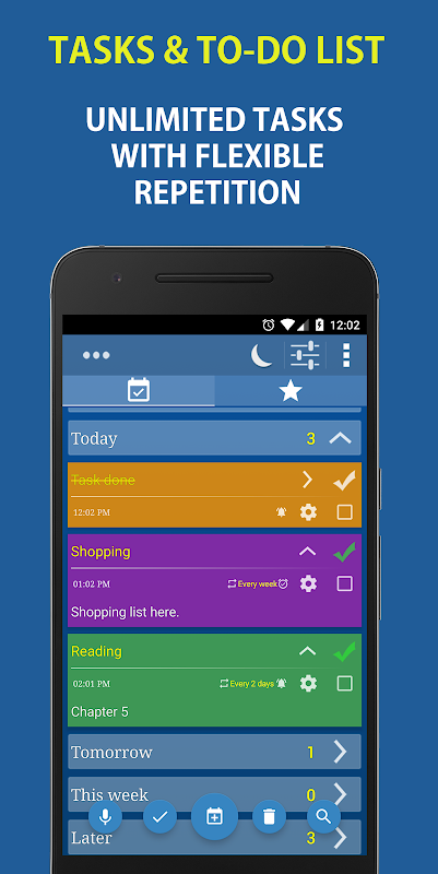✔ Les tâches sont organisées d'une manière chronologique sur cinq onglets ( Avant aujourd'hui , Aujourd'hui , Demain , Cette semaine , Plus tard ).