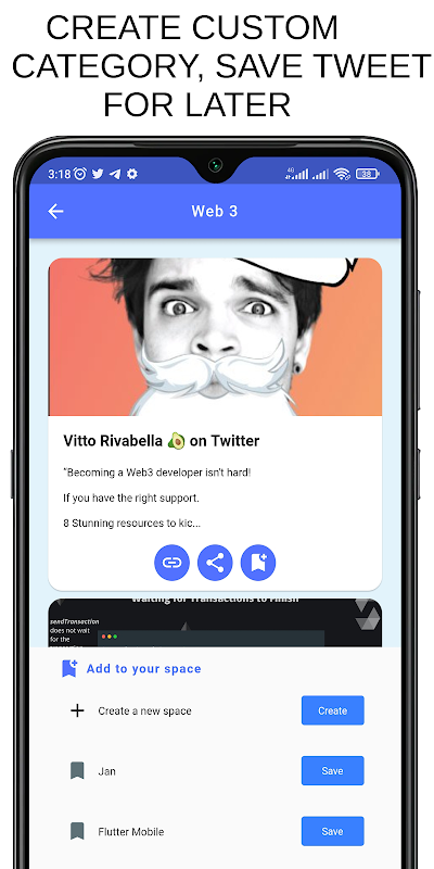 - Create your own personal categories (spaces) and save tweets of interest.