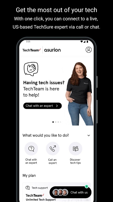 • En quelques secondes, connectez-vous en direct à un TechTeam via un appel ou une discussion. Aucune retenue ou transfert.