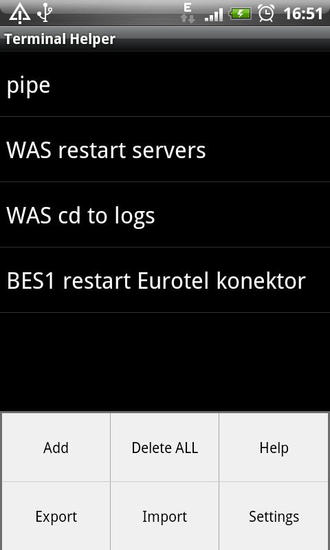 DO NOT USE ENTER in Command! This application is designed to help people working with SSH/ConnectBot/Terminal applications with possibility paste something into it. You can make list of often used long commands here and then map Terminal Helper to some shortcut key on your keyboard, and pick any of these commands just with one click to your clipboard. Also, you can use word #customString# somewhere in your command line (so many times, as you wish), and Terminal Helper will ask you for replacement every time before copying command to clipboard. More information and complete guide on website.