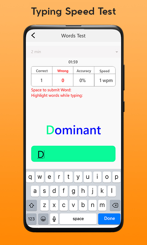 ✔️ Test de mots : Dans le test de vitesse de frappe, les utilisateurs peuvent vérifier et améliorer la vitesse de frappe avec le test de mots.