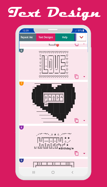 In text Lab screen you will found pre built text of love welcome and more. You use these text by clicking copy button and use where you want.