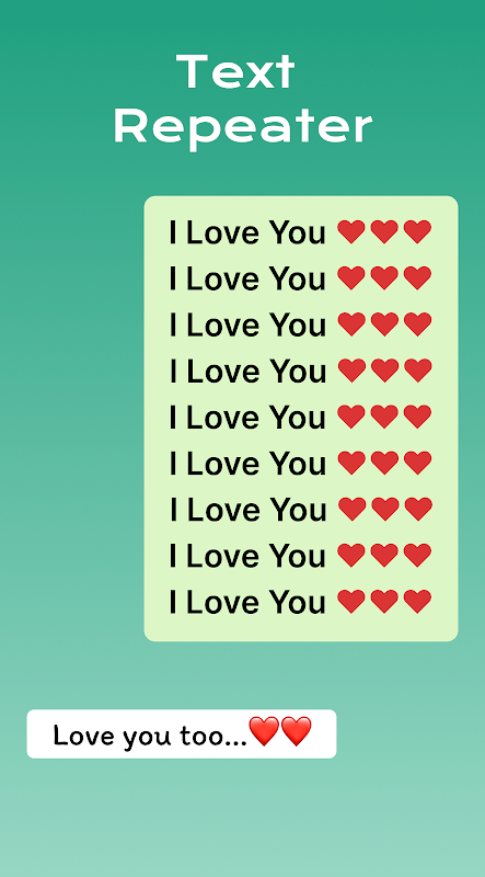 Cette application Répéteur de texte : Répéter le texte et les Emojis est amusante et engageante. Vous créerez des messages uniques, répéterez votre texte et convertirez des mots en emoji dans vos discussions. Exprimez vos sentiments et surprenez vos amis avec des modèles de mots inhabituels et des conceptions de texte uniques, ainsi que d'autres conceptions de texte répétées qu'ils n'ont jamais vues auparavant. Présentez vos émotions en retapant « Je suis désolé » ou « Je t'aime » plusieurs fois.