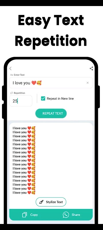 Vous en avez assez de copier et coller le même texte encore et encore ? Et à ce moment-là, tout ce dont nous avons besoin, c'est d'un répéteur de texte qui répète le texte jusqu'à 10 000 fois. Nous avons tous des situations dans lesquelles nous souhaitons prouver nos émotions en répétant un texte encore et encore. Pour toutes ces situations, cette application de répétition de texte est un don de Dieu. Ce que cela fait, c'est répéter n'importe quel texte autant que vous le souhaitez. Il s'agit d'une sorte de répéteur de messages, d'une application unique de bombardement de texte permettant d'envoyer des messages à plusieurs reprises. La partie amusante de cette application de répéteur de texte est qu'elle vous permet également de définir votre limite de répétition avec la répétition de texte sur une nouvelle ligne.