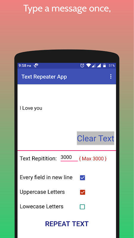 Want to do Text or SMS Bombing then download Text Repeater -The Text Multiplier App and repeat text unlimited times with a single click.