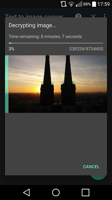 En outre, vous pouvez essayer de décoder une image aléatoire dans le texte pour voir ce qui se cache là-bas, mais ne soyez pas surpris lorsque le résultat est insensé;) Même si, vous pouvez cacher votre information secrète entre les caractères senselesss de l'image originale, de telle sorte que personne ne sera jamais en mesure de les trouver,