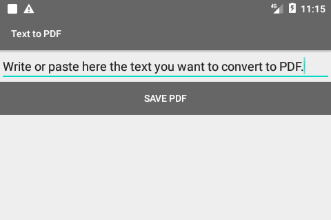 Cette application est un convertisseur de fichiers TEXT en PDF, écrivez ou tapez ou collez du texte dans un champ de texte de l'application et appuyez sur le bouton de conversion, et l'application créera un document PDF contenant le texte que vous avez écrit, et le fichier sera enregistré dans votre smartphone pour l'utiliser dans une autre application pour l'envoyer par e-mail ou d'une autre manière.