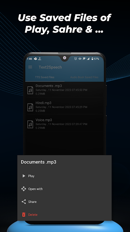 Browse saved audio converted from text using TTS or Text to speech functionalities