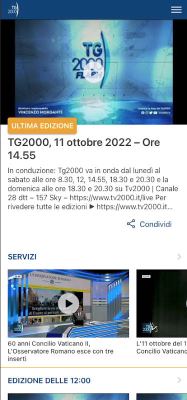 L'App officiel de TG2000 pour regarder en streaming toutes les éditions du bulletin de nouvelles, services de vidéo à la demande, le reportage, les idées et les colonnes des journaux, avec la possibilité de partager via le contenu des médias sociaux et d'interagir avec les éditeurs et journalistes.