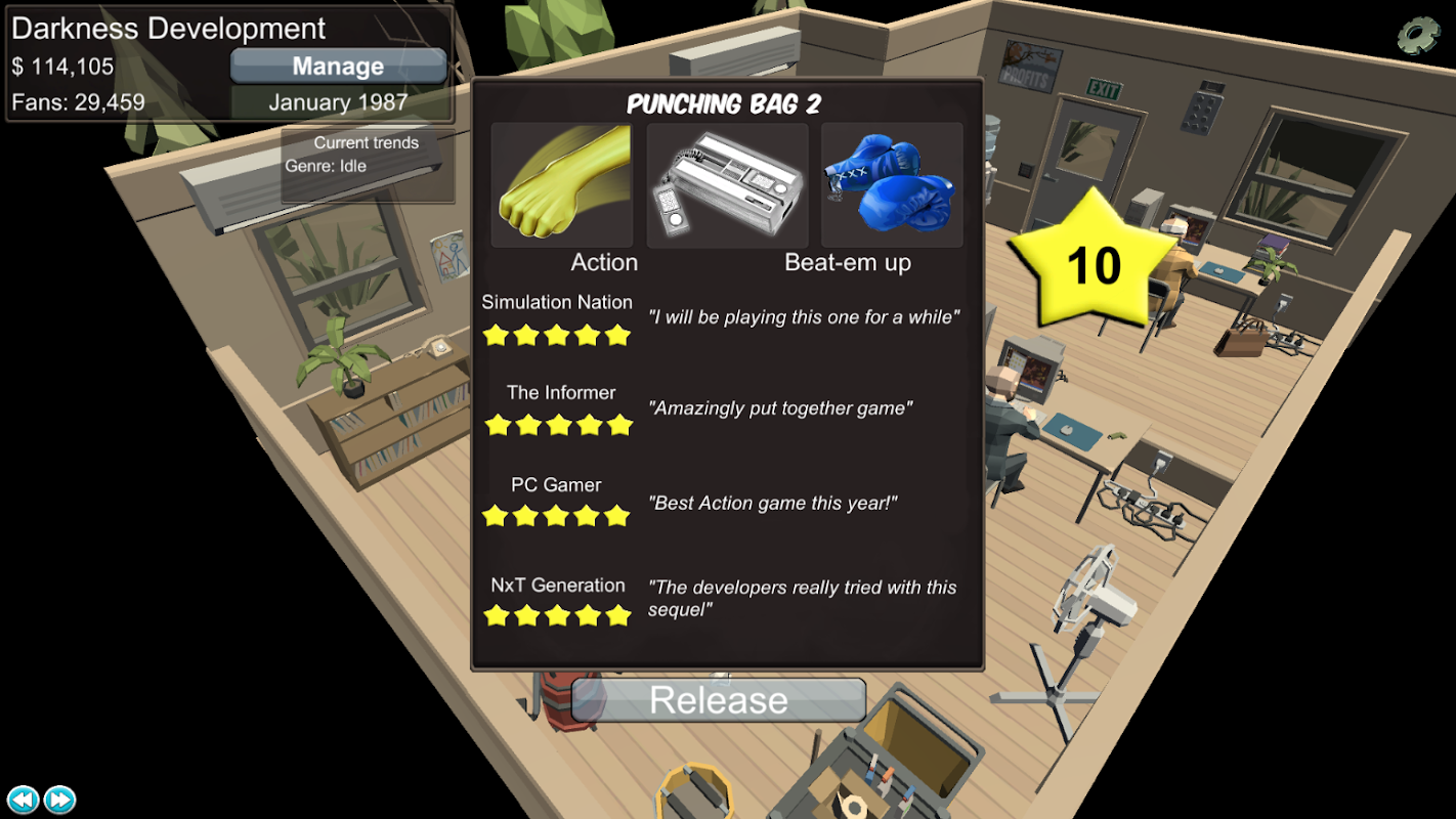 Développez votre entreprise en quittant votre sous-sol pour un bureau où d'autres développeurs peuvent rejoindre vos rangs. Améliorez votre bureau pour débloquer des compétences supplémentaires qui vous aideront à développer des jeux de meilleure qualité, ou tentez votre chance en créant votre propre console de jeu.