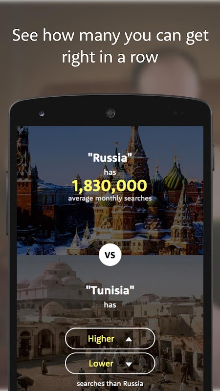 Il est facile à jouer, il suffit de décider quel terme de recherche a été recherché pour la plupart en sélectionnant plus ou moins élevé. L'objectif est d'obtenir le plus à droite dans une rangée.