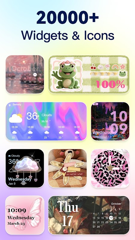 Trouvez des widgets horloge, calendrier, météo et bien plus encore : explorez des centaines de jeux d'icônes personnalisés, des icônes minimalistes dégradées aux packs colorés et audacieux. Chaque détail est pensé pour une expérience utilisateur complète, cohérente et visuellement époustouflante.