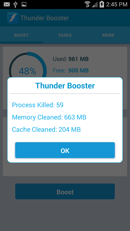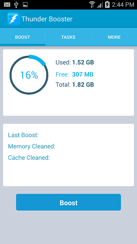 Boost your RAM with single touch. Touch boost button and clear running process. In Tasks tab you can swipe to clean individual process from ram memory. In more tab you also know about your internal and external memory status.