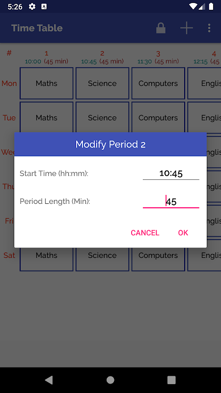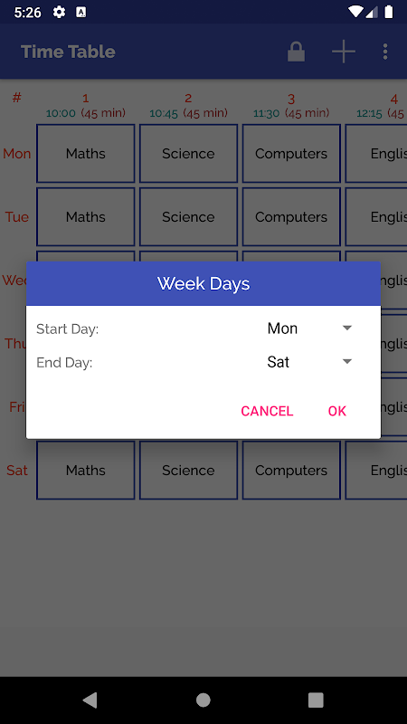 1) Time Table app creates 7 Periods with start time 10AM with Period Length 45 Minutes for week days starting from Monday to Saturday.