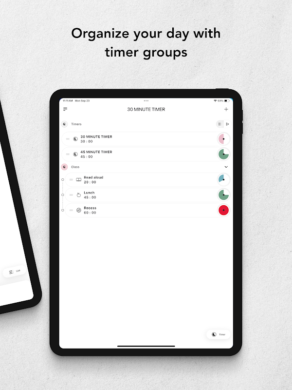 Utilisez l’Application Time Timer pour Android afin de créer et sauvegarder des minuteurs pour vos activités quotidiennes, comme votre préparation matinale, les réunions, projets et activités des enfants ou configurez un nouveau minuteur au moment où vous en avez besoin.