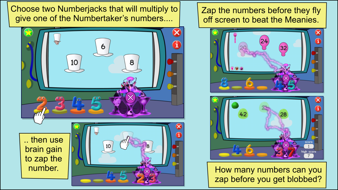 Four activities help children learn and practise their times tables. Each level has its own help screen outlining how the activity works and briefly describing some of the educational opportunities it provides.