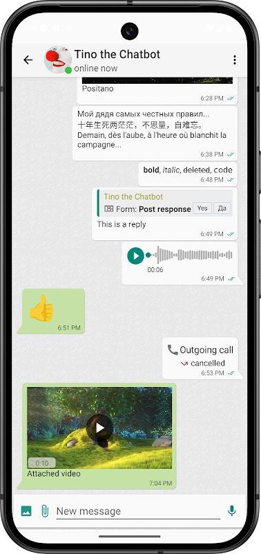 Formatage de messages riches, appels vidéo et vocaux, messages vocaux. Messages individuels et de groupe. Canaux de publication avec un nombre illimité d'abonnés en lecture seule. Multiplateforme : Android, iOS, ordinateur de bureau sous Windows et Linux.