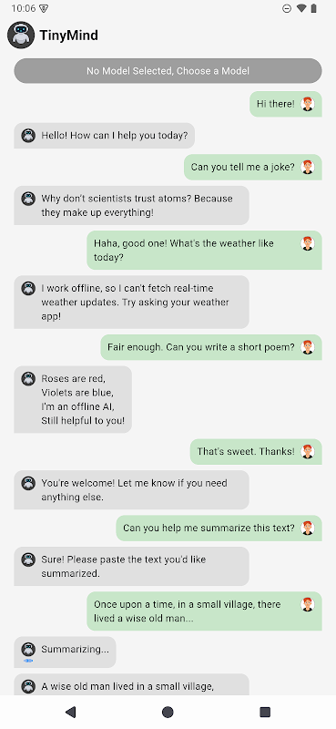 Tiny AI est un puissant assistant IA hors ligne qui s'exécute directement sur votre appareil : pas d'Internet, pas de traitement cloud et aucun partage de données. Optimisé par des modèles locaux GGUF comme TinyLlama, il vous permet de profiter de la puissance de l'IA générative où et quand vous le souhaitez, en toute confidentialité et liberté.