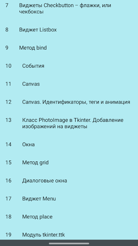 Le cours "Tkinter. Programmation GUI en Python" présente les fonctionnalités de création d'une interface utilisateur graphique à l'aide du package tkinter du langage de programmation Python. L'annexe est complétée par des exemples de solutions pratiques. Les leçons elles-mêmes sont disponibles gratuitement sur https://younglinux.info/tkinter/course. Une version PDF imprimable du cours avec les réponses aux exercices pratiques est également disponible sur le site Internet.