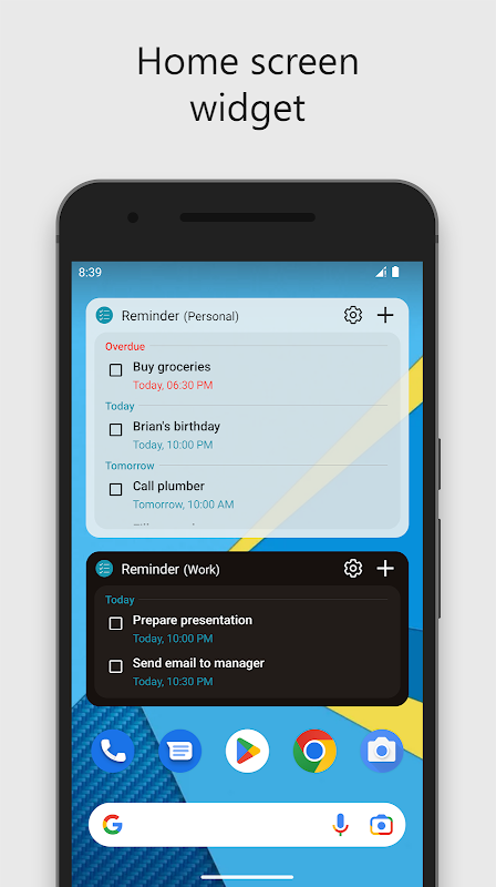 • Le widget de l'écran d'accueil intelligent affiche instantanément ce qu'il faut faire, le widget redimensionnable affiche les tâches à venir.