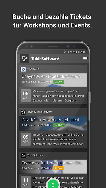 Diese App verbindet Sie direkt mit Tobit.Software. Damit haben Sie den schnellen Zugriff auf Informationen zum Unternehmen und zu den Produkten sowie auf individuelle Services. Sie können per Knopfdruck Produkte bestellen und Workshops und Trainings buchen. Push-Notifications informieren über persönliche Nachrichten, den Status von Bestellungen und erinnern an gebuchte Termine.