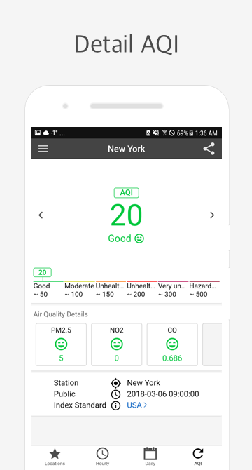 'Temps Horaire' met à jour en temps réel sur l'information et les indices de la qualité globale de l'air (particules de pollution PM10 / PM2.5, O3, NO2, CO, SO2, IQA) (Corée seulement encore)