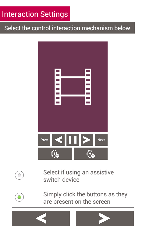 Users may also choose between a variety of possible interaction mechanisms, including straightforwardly clicking the buttons displayed on-screen, using multiple taps anywhere on-screen to select a particular button (tapping twice to activate the second button displayed for example), holding your touch for a duration specific to each button, or holding your touch to cycle between buttons.