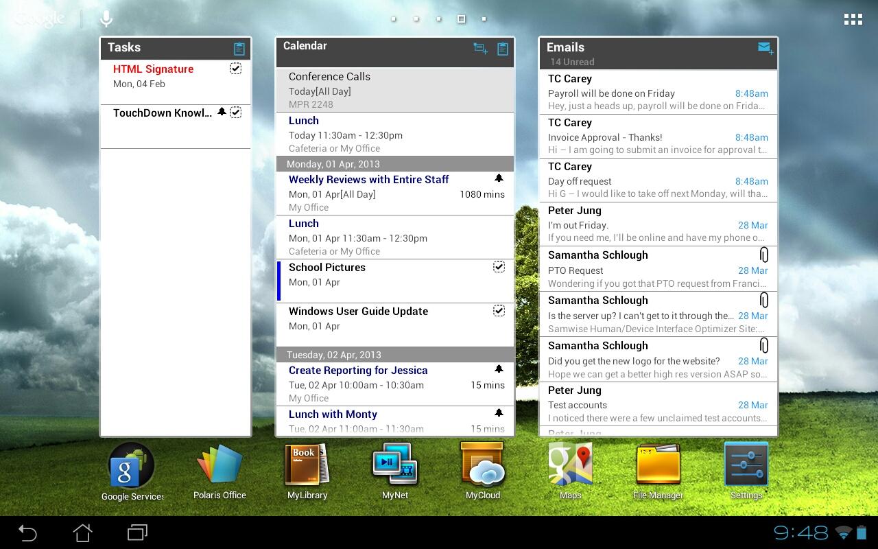 TouchDown HD gets your Email, Contacts, Calendar and Tasks from your corporate Exchange server, and gives you a single tabbed view.