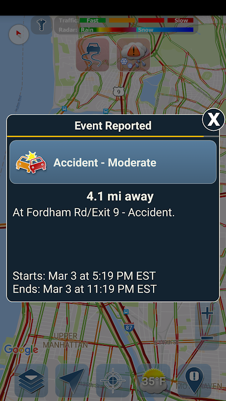 Évitez la congestion du trafic lourd en sachant où les parties les plus lentes de votre itinéraire sont. spotters communautaires fournissent des rapports d'incidents qui peuvent vous aider à éviter les conditions routières et météorologiques dangereuses telles que les accidents, les nids de poule, les routes dantes, et plus encore.