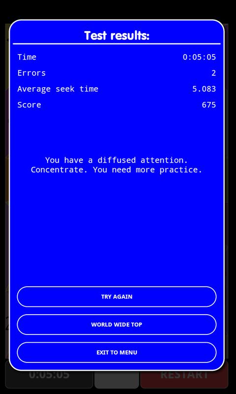 Ce programme basé sur une technique de formation et les tests de concentration de l'attention des pilotes. Le jeu dispose de deux modes - apprentissage et de test. Le test est disponible si vous séance d'entraînement complète en moins de 50 secondes. Rapports de formation sont stockés dans la base de données et, selon le tableau de vos progrès est construit. Aussi, vous pouvez enregistrer vos meilleures réalisations sur le serveur et de les comparer avec d'autres joueurs. Attraper seulement 20 minutes par jour, vous permettra d'améliorer votre mémoire, l'attention et la concentration.